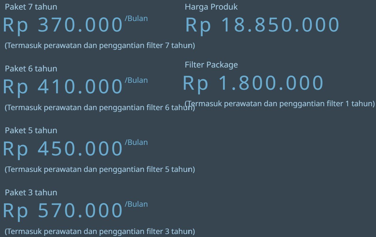 | Masa Filter / Kapasitas | Plus Sediment : 6 Bulan Pre-Carbon : 12 Bulan RO Membrane : 24 Bulan Plus-Inno Sense : 18 Bulan Antibacterial : 12 Bulan |